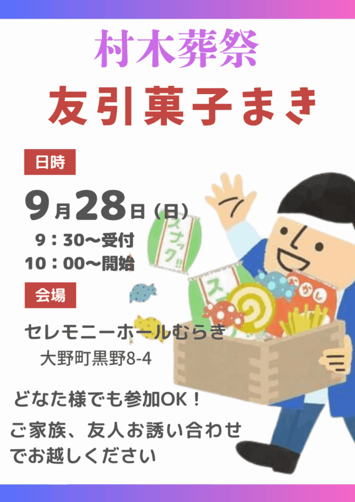 さて、今月も村木葬祭の「友引菓子まき」を開催します(^^♪